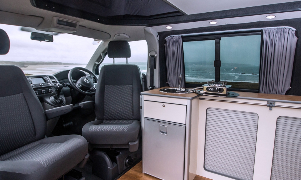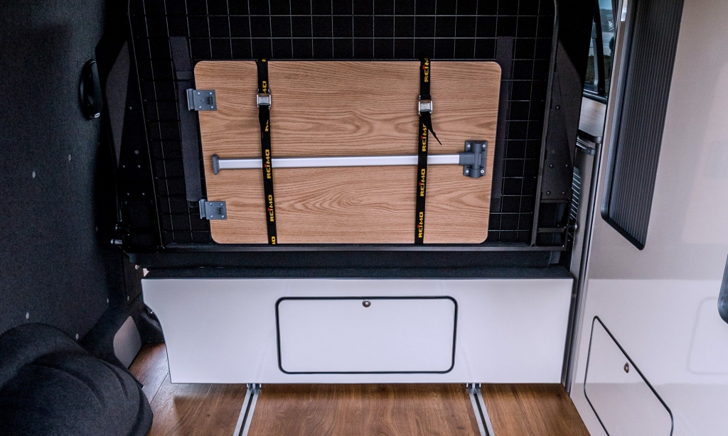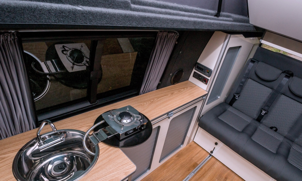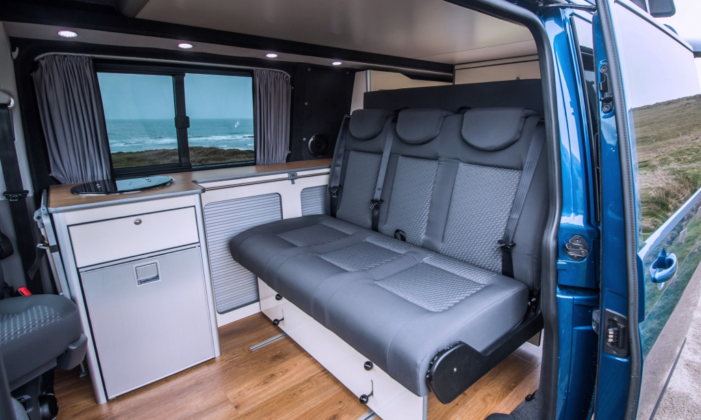Spacious family camper with generous storage to undertake both short and long trips even when fully loaded with sports equipment. The van offers modern and functional solutions with the combination sink unit and slimline units that allowed a three-seater bed to be installed. The bed rail system meant the couple could put a large dog cage at the back and also bring the seatbed forward to be close to their daughter while travelling.